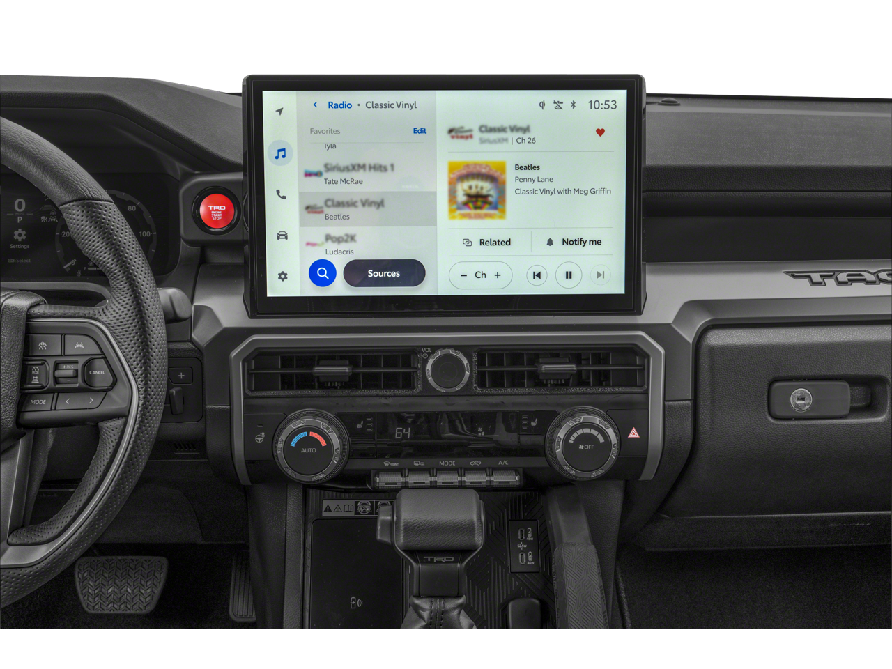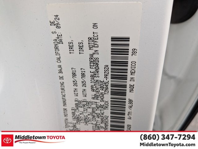 Fresh oil change, 4WD, 3D Multi-Terrain Monitor, 8-Way Power Driver & Passenger Seat Adjusters, ABS brakes, Active Cruise Control, Alloy wheels, Anti-whiplash front head restraints, Apple CarPlay/Android Auto, Auto High-beam Headlights, Auto-dimming Rear-View mirror, Deck DC Power Pre-wire, Digital Key Capability, Digital Rearview Mirror, Dual front impact airbags, Dual front side impact airbags, Dual Zone Automatic Climate Control, Electronic Stability Control, Emergency communication system: Safety Connect (1-year trial), Exterior Parking Camera Rear, Front & Rear Parking Assist w/Automatic Braking, Front anti-roll bar, Front fog lights, Fully automatic headlights, Heated & Ventilated Front Seats, Heated door mirrors, Heated Leather-Trimmed Steering Wheel, Illuminated entry, Integrated Trailer Brake Controller, JBL Premium Audio, Knee airbag, Low tire pressure warning, Occupant sensing airbag, Overhead airbag, Panic alarm, Pedestrian Detection, Power Horizontal Rear Window, Power Tilt/Slide Moonroof w/Sliding Sunshade, Pre-Wired Auxiliary Switches, Qi-Compatible Wireless Charging, Radio: 14" Toyota Audio Multimedia, Remote keyless entry, Security system, SofTex Seat Trim, Speed control, TACOMA Stamped Power Open & Close Tailgate, Towing Hitch, Towing Technology Package, Traction control, TRD Off Road Premium Package.