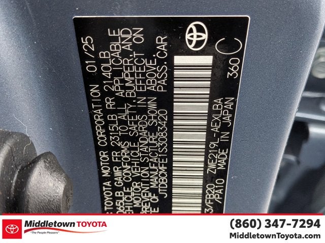 1.8L DOHC 16V VVT, 4-Wheel Disc Brakes, 6 Speakers, ABS brakes, Apple CarPlay/Android Auto, Auto High-beam Headlights, Brake assist, Delay-off headlights, Dual front impact airbags, Dual front side impact airbags, Electronic Stability Control, Emergency communication system: Safety Connect (up to 10-year trial subscription), Exterior Parking Camera Rear, Fully automatic headlights, Knee airbag, Low tire pressure warning, Overhead airbag, Premium Fabric Seat Trim, Radio: 8" Toyota Audio Multimedia, Rear side impact airbag, Telescoping steering wheel, Tilt steering wheel, Trip computer.